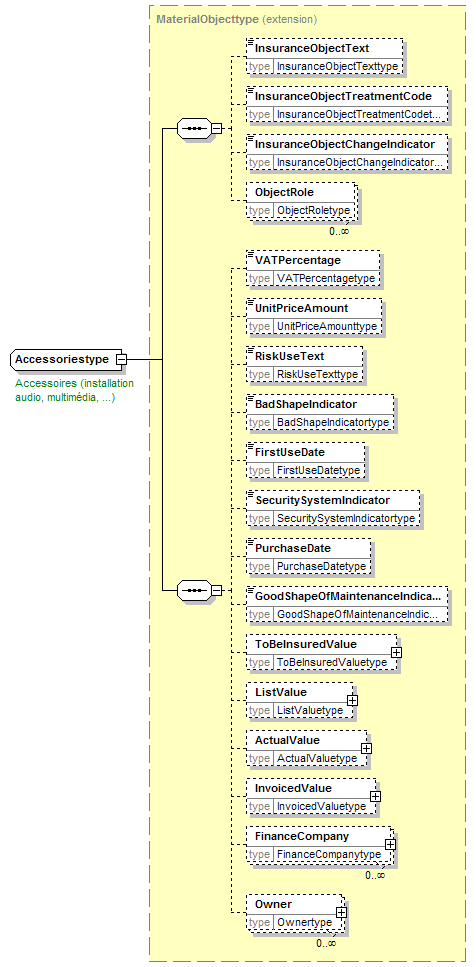| source | <xsd:complexType name="Accessoriestype"> <xsd:annotation> <xsd:appinfo source="tb2Semantics">A supplementary part, a component that is added to something to improve it.</xsd:appinfo> <xsd:appinfo source="tb2Edifact">(ROD+105)</xsd:appinfo> <xsd:documentation source="BusinessTerm" xml:lang="fr">Accessoires (installation audio, multimédia, ...)</xsd:documentation> <xsd:documentation source="BusinessTerm" xml:lang="nl">Accessoires (installatie audio, multimedia, ...)</xsd:documentation> <xsd:documentation source="BusinessTerm" xml:lang="ge">Zubehör (Audio-Ausrüstung, Multimedia, ...)</xsd:documentation> <xsd:documentation source="BusinessTerm" xml:lang="en">Accessories (Audio, Multimedia, ...)</xsd:documentation> <xsd:documentation source="BusinessDefinition" xml:lang="fr">Identifie une personne ou une chose placée sous la garantie de l'assurance. Un objet de risque est l'indication, dans la police, d'un objet assuré. Plusieurs objets de risque peuvent être assurés dans le cadre d'une seule police.<br/>Exemples : un véhicul</xsd:documentation> <xsd:documentation source="BusinessDefinition" xml:lang="nl">Identificeert een persoon of een zaak, onderwerp van waarborg in een verzekering. Een risico-object is de aanduiding, binnen de polis, van een verzekerd voorwerp. Binnen één polis kunnen er meerdere risico-objecten verzekerd zijn.<br/>Voorbeelden : een vo</xsd:documentation> <xsd:documentation source="BusinessDefinition" xml:lang="en">Risk Object</xsd:documentation> </xsd:annotation> <xsd:complexContent> <xsd:extension base="MaterialObjecttype"/> </xsd:complexContent> </xsd:complexType> |