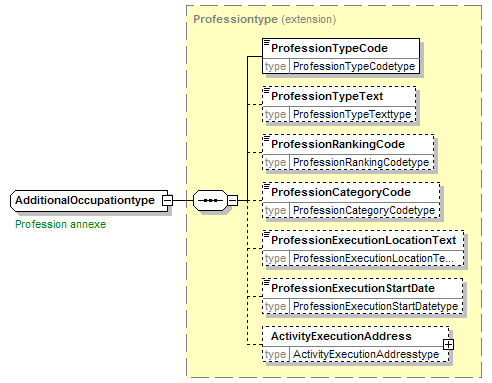 | source | <xsd:complexType name="AdditionalOccupationtype"> <xsd:annotation> <xsd:appinfo source="tb2Semantics">An occupation (= activity for which you are paid) executed by a party in addition to its primary occupation.</xsd:appinfo> <xsd:appinfo source="tb2Edifact">(PFN+002)</xsd:appinfo> <xsd:documentation source="BusinessTerm" xml:lang="fr">Profession annexe</xsd:documentation> <xsd:documentation source="BusinessTerm" xml:lang="nl">Bijberoep</xsd:documentation> <xsd:documentation source="BusinessTerm" xml:lang="ge">Nebenberuf</xsd:documentation> <xsd:documentation source="BusinessTerm" xml:lang="en">Additional occupation</xsd:documentation> <xsd:documentation source="BusinessDefinition" xml:lang="fr">Contient une profession.</xsd:documentation> <xsd:documentation source="BusinessDefinition" xml:lang="nl">Bevat een beroep.</xsd:documentation> <xsd:documentation source="BusinessDefinition" xml:lang="en">Profession - An occupation (= activity for which you are paid) executed by a party in addition to its primary occupation.</xsd:documentation> </xsd:annotation> <xsd:complexContent> <xsd:extension base="Professiontype"/> </xsd:complexContent> </xsd:complexType> |
