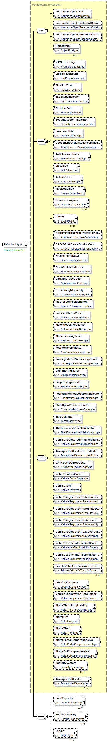 | source | <xsd:complexType name="AirVehicletype"> <xsd:annotation> <xsd:appinfo source="tb2Semantics">A conveyance that transports people or objects through the air.</xsd:appinfo> <xsd:appinfo source="tb2Edifact">(ROD+009)</xsd:appinfo> <xsd:documentation source="BusinessTerm" xml:lang="fr">Engin(s) aérien(s)</xsd:documentation> <xsd:documentation source="BusinessTerm" xml:lang="nl">Luchtvaarttuig(en)</xsd:documentation> <xsd:documentation source="BusinessTerm" xml:lang="ge">Luftfahrzeug(e)</xsd:documentation> <xsd:documentation source="BusinessTerm" xml:lang="en">Aircraft(s)</xsd:documentation> <xsd:documentation source="BusinessDefinition" xml:lang="fr">Identifie une personne ou une chose placée sous la garantie de l'assurance. Un objet de risque est l'indication, dans la police, d'un objet assuré. Plusieurs objets de risque peuvent être assurés dans le cadre d'une seule police.<br/>Exemples : un véhicul</xsd:documentation> <xsd:documentation source="BusinessDefinition" xml:lang="nl">Identificeert een persoon of een zaak, onderwerp van waarborg in een verzekering. Een risico-object is de aanduiding, binnen de polis, van een verzekerd voorwerp. Binnen één polis kunnen er meerdere risico-objecten verzekerd zijn.<br/>Voorbeelden : een vo</xsd:documentation> <xsd:documentation source="BusinessDefinition" xml:lang="en">Risk Object</xsd:documentation> </xsd:annotation> <xsd:complexContent> <xsd:extension base="Vehicletype"> <xsd:sequence> <xsd:element name="LoadCapacity" type="LoadCapacitytype" minOccurs="0" maxOccurs="unbounded"/> <xsd:element name="SeatingCapacity" type="SeatingCapacitytype" minOccurs="0" maxOccurs="unbounded"/> <xsd:element name="Engine" type="Enginetype" minOccurs="0" maxOccurs="unbounded"/> </xsd:sequence> </xsd:extension> </xsd:complexContent> </xsd:complexType> |