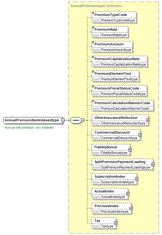 | source | <xsd:complexType name="AnnualPremiumNonIndexedtype"> <xsd:annotation> <xsd:appinfo source="tb2Semantics">The premium, excluding costs and charges, covering a one-year period, not following index fluctuations.</xsd:appinfo> <xsd:documentation source="BusinessTerm" xml:lang="en">Annual net premium, non indexed</xsd:documentation> <xsd:documentation source="BusinessTerm" xml:lang="nl">Jaarlijkse netto premie, niet geïndexeerd</xsd:documentation> <xsd:documentation source="BusinessTerm" xml:lang="fr">Prime nette annuelle, non indexée</xsd:documentation> </xsd:annotation> <xsd:complexContent> <xsd:extension base="AnnualPremiumtype"/> </xsd:complexContent> </xsd:complexType> |