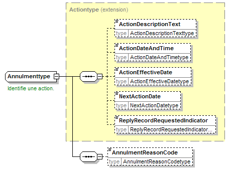 | source | <xsd:complexType name="Annulmenttype"> <xsd:annotation> <xsd:appinfo source="tb2Semantics">Final cessation.</xsd:appinfo> <xsd:appinfo source="tb2Edifact">(ACT)</xsd:appinfo> <xsd:documentation source="BusinessDefinition" xml:lang="fr">Identifie une action.</xsd:documentation> <xsd:documentation source="BusinessDefinition" xml:lang="nl">Identificeert een actie.</xsd:documentation> <xsd:documentation source="BusinessDefinition" xml:lang="en">Action</xsd:documentation> <xsd:documentation source="BusinessTerm" xml:lang="en">Annulment</xsd:documentation> <xsd:documentation source="BusinessTerm" xml:lang="nl">Annulatie</xsd:documentation> <xsd:documentation source="BusinessTerm" xml:lang="fr">Annulation</xsd:documentation> </xsd:annotation> <xsd:complexContent> <xsd:extension base="Actiontype"> <xsd:sequence> <xsd:element name="AnnulmentReasonCode" type="AnnulmentReasonCodetype" minOccurs="0"/> </xsd:sequence> </xsd:extension> </xsd:complexContent> </xsd:complexType> |
