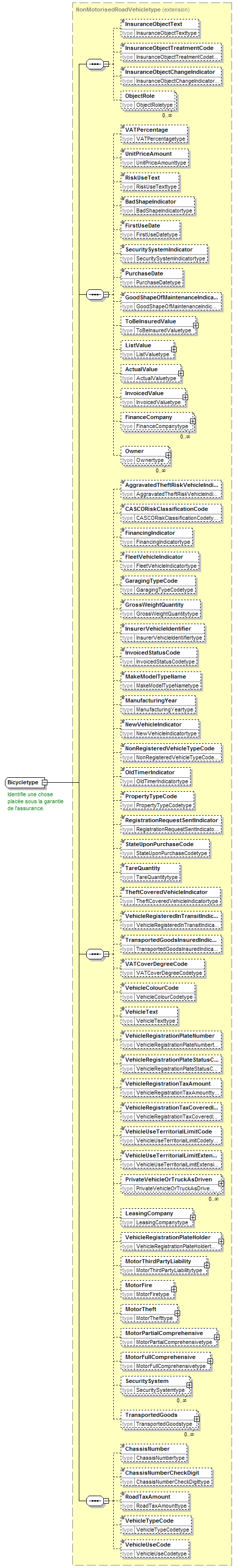| source | <xsd:complexType name="Bicycletype"> <xsd:annotation> <xsd:appinfo source="tb2Semantics">A two-wheeled vehicle on which a person rides, using pedals to drive it along.</xsd:appinfo> <xsd:appinfo source="tb2Edifact">(ROD+006)</xsd:appinfo> <xsd:documentation source="BusinessDefinition" xml:lang="fr">Identifie une chose placée sous la garantie de l'assurance.</xsd:documentation> <xsd:documentation source="BusinessDefinition" xml:lang="nl">Identificeert een zaak, onderwerp van waarborg in een verzekering.</xsd:documentation> <xsd:documentation source="BusinessDefinition" xml:lang="en">Risk Object - A two-wheeled vehicle on which a person rides, using pedals to drive it along.</xsd:documentation> <xsd:documentation source="BusinessTerm" xml:lang="en">Bicycle</xsd:documentation> <xsd:documentation source="BusinessTerm" xml:lang="nl">Fiets</xsd:documentation> <xsd:documentation source="BusinessTerm" xml:lang="fr">Bicyclette</xsd:documentation> </xsd:annotation> <xsd:complexContent> <xsd:extension base="NonMotorisedRoadVehicletype"/> </xsd:complexContent> </xsd:complexType> |