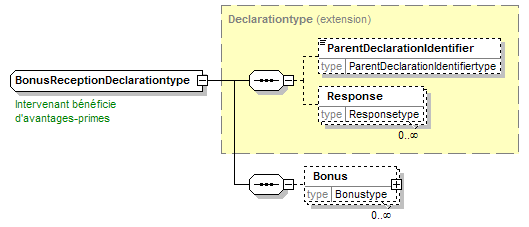 | source | <xsd:complexType name="BonusReceptionDeclarationtype"> <xsd:annotation> <xsd:appinfo source="tb2Semantics">Coded indication of whether or not bonuses (= incentives or additional payments) are received.</xsd:appinfo> <xsd:appinfo source="tb2Edifact">(QRS+CQ45)</xsd:appinfo> <xsd:documentation source="BusinessTerm" xml:lang="fr">Intervenant bénéficie d'avantages-primes</xsd:documentation> <xsd:documentation source="BusinessTerm" xml:lang="nl">Betrokkene geniet premievoordelen</xsd:documentation> <xsd:documentation source="BusinessTerm" xml:lang="ge">Betreffender Person geniest prämien</xsd:documentation> <xsd:documentation source="BusinessTerm" xml:lang="en">Party concerned enjoys bonuses</xsd:documentation> <xsd:documentation source="BusinessDefinition" xml:lang="fr">Identifie une déclaration.</xsd:documentation> <xsd:documentation source="BusinessDefinition" xml:lang="nl">Identificeert een verklaring.</xsd:documentation> <xsd:documentation source="BusinessDefinition" xml:lang="en">Declaration</xsd:documentation> </xsd:annotation> <xsd:complexContent> <xsd:extension base="Declarationtype"> <xsd:sequence> <xsd:element name="Bonus" type="Bonustype" minOccurs="0" maxOccurs="unbounded"/> </xsd:sequence> </xsd:extension> </xsd:complexContent> </xsd:complexType> |