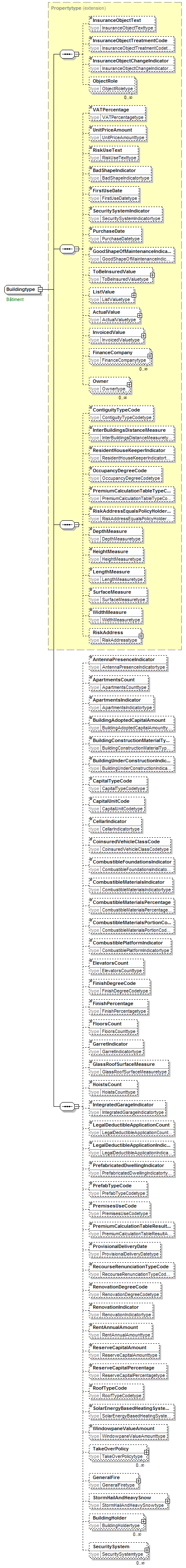 | children | InsuranceObjectText InsuranceObjectTreatmentCode InsuranceObjectChangeIndicator ObjectRole VATPercentage UnitPriceAmount RiskUseText BadShapeIndicator FirstUseDate SecuritySystemIndicator PurchaseDate GoodShapeOfMaintenanceIndicator ToBeInsuredValue ListValue ActualValue InvoicedValue FinanceCompany Owner ContiguityTypeCode InterBuildingsDistanceMeasure ResidentHouseKeeperIndicator OccupancyDegreeCode PremiumCalculationTableTypeCode RiskAddressEqualsPolicyHolderAddressIndicator DepthMeasure HeightMeasure LengthMeasure SurfaceMeasure WidthMeasure RiskAddress AntennaPresenceIndicator ApartmentsCount ApartmentsIndicator BuildingAdoptedCapitalAmount BuildingConstructionMaterialTypeCode BuildingUnderConstructionIndicator CapitalTypeCode CapitalUnitCode CellarIndicator CoinsuredVehicleClassCode CombustibleFoundationsIndicator CombustibleMaterialsIndicator CombustibleMaterialsPercentage CombustibleMaterialsPortionCode CombustiblePlatformIndicator ElevatorsCount FinishDegreeCode FinishPercentage FloorsCount GarretIndicator GlassRoofSurfaceMeasure HoistsCount IntegratedGarageIndicator LegalDeductibleApplicationCount LegalDeductibleApplicationIndicator PrefabricatedDwellingIndicator PrefabTypeCode PremisesUseCode PremiumCalculationTableResultAmount ProvisionalDeliveryDate RecourseRenunciationTypeCode RenovationDegreeCode RenovationIndicator RentAnnualAmount ReserveCapitalAmount ReserveCapitalPercentage RoofTypeCode SolarEnergyBasedHeatingSystemIndicator WindowpaneValueAmount TakeOverPolicy GeneralFire StormHailAndHeavySnow BuildingHolder SecuritySystem | ||||||||||||||||||