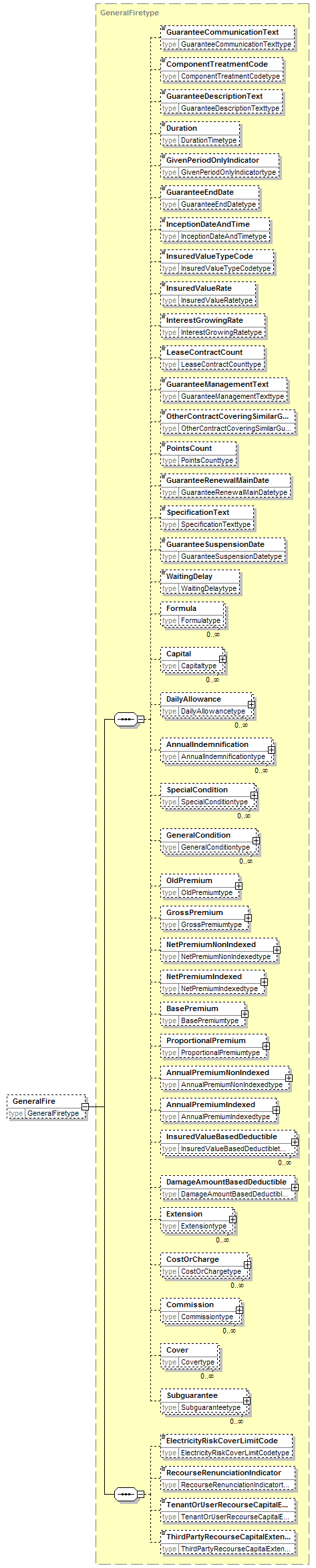 | children | GuaranteeCommunicationText ComponentTreatmentCode GuaranteeDescriptionText Duration GivenPeriodOnlyIndicator GuaranteeEndDate InceptionDateAndTime InsuredValueTypeCode InsuredValueRate InterestGrowingRate LeaseContractCount GuaranteeManagementText OtherContractCoveringSimilarGuaranteeIndicator PointsCount GuaranteeRenewalMainDate SpecificationText GuaranteeSuspensionDate WaitingDelay Formula Capital DailyAllowance AnnualIndemnification SpecialCondition GeneralCondition OldPremium GrossPremium NetPremiumNonIndexed NetPremiumIndexed BasePremium ProportionalPremium AnnualPremiumNonIndexed AnnualPremiumIndexed InsuredValueBasedDeductible DamageAmountBasedDeductible Extension CostOrCharge Commission Cover Subguarantee ElectricityRiskCoverLimitCode RecourseRenunciationIndicator TenantOrUserRecourseCapitalExtensionAmount ThirdPartyRecourseCapitalExtensionAmount SnowPressureExtensionIndicator | ||||||||