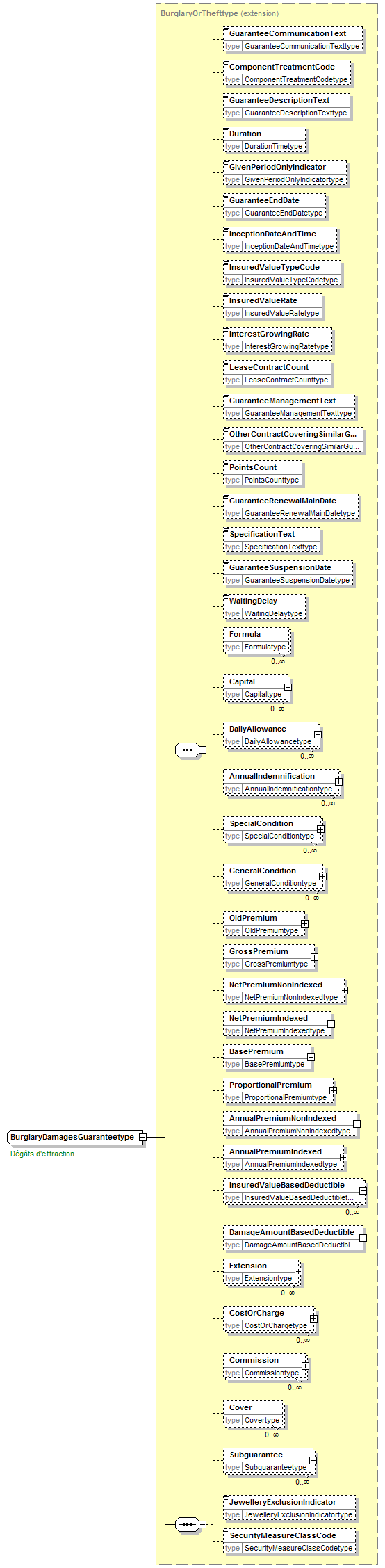 | children | GuaranteeCommunicationText ComponentTreatmentCode GuaranteeDescriptionText Duration GivenPeriodOnlyIndicator GuaranteeEndDate InceptionDateAndTime InsuredValueTypeCode InsuredValueRate InterestGrowingRate LeaseContractCount GuaranteeManagementText OtherContractCoveringSimilarGuaranteeIndicator PointsCount GuaranteeRenewalMainDate SpecificationText GuaranteeSuspensionDate WaitingDelay Formula Capital DailyAllowance AnnualIndemnification SpecialCondition GeneralCondition OldPremium GrossPremium NetPremiumNonIndexed NetPremiumIndexed BasePremium ProportionalPremium AnnualPremiumNonIndexed AnnualPremiumIndexed InsuredValueBasedDeductible DamageAmountBasedDeductible Extension CostOrCharge Commission Cover Subguarantee JewelleryExclusionIndicator SecurityMeasureClassCode | ||||||||||||||||