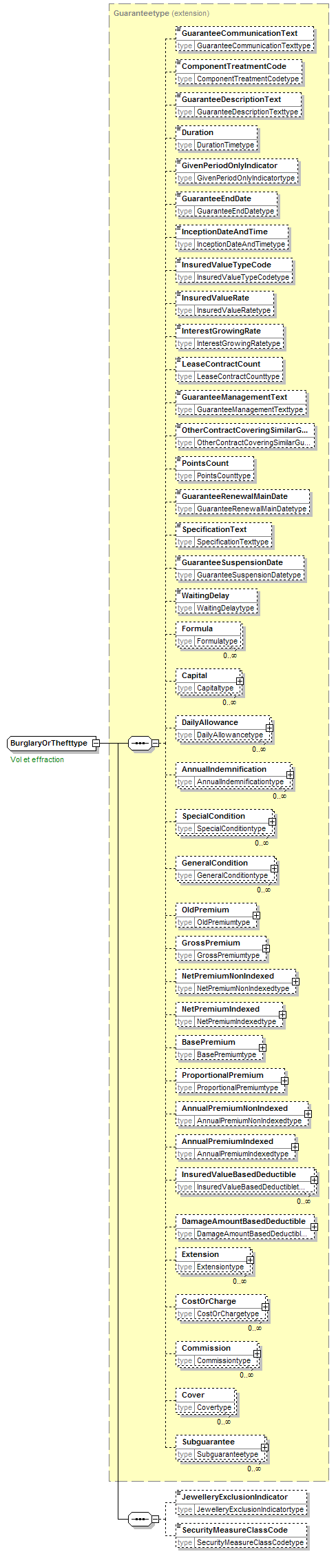 | source | <xsd:complexType name="BurglaryOrThefttype"> <xsd:annotation> <xsd:appinfo source="tb2Semantics">Insurance against property being taken away by someone by means of burglary, robbery or larceny without any intention of returning it. (19.06.2007 : namechange into ...Or...)</xsd:appinfo> <xsd:appinfo source="tb2Edifact">(ICD+360)</xsd:appinfo> <xsd:documentation source="BusinessTerm" xml:lang="fr">Vol et effraction</xsd:documentation> <xsd:documentation source="BusinessTerm" xml:lang="nl">Diefstal en inbraak</xsd:documentation> <xsd:documentation source="BusinessTerm" xml:lang="ge">Diebstahl un Einbruch</xsd:documentation> <xsd:documentation source="BusinessTerm" xml:lang="en">Theft and burglary</xsd:documentation> <xsd:documentation source="BusinessDefinition" xml:lang="fr">Garantie couvrant la soustraction frauduleuse d’un bien appartenant à un tiers.</xsd:documentation> <xsd:documentation source="BusinessDefinition" xml:lang="nl">Waarborg ter dekking van de bedrieglijke ontvreemding van een goed dat aan een derde toebehoort.</xsd:documentation> <xsd:documentation source="BusinessDefinition" xml:lang="en">Guarantee</xsd:documentation> </xsd:annotation> <xsd:complexContent> <xsd:extension base="Guaranteetype"> <xsd:sequence> <xsd:element name="JewelleryExclusionIndicator" type="JewelleryExclusionIndicatortype" minOccurs="0"/> <xsd:element name="SecurityMeasureClassCode" type="SecurityMeasureClassCodetype" minOccurs="0"/> </xsd:sequence> </xsd:extension> </xsd:complexContent> </xsd:complexType> |