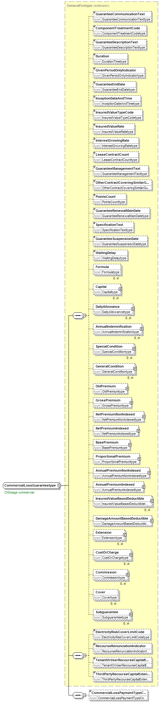 | children | GuaranteeCommunicationText ComponentTreatmentCode GuaranteeDescriptionText Duration GivenPeriodOnlyIndicator GuaranteeEndDate InceptionDateAndTime InsuredValueTypeCode InsuredValueRate InterestGrowingRate LeaseContractCount GuaranteeManagementText OtherContractCoveringSimilarGuaranteeIndicator PointsCount GuaranteeRenewalMainDate SpecificationText GuaranteeSuspensionDate WaitingDelay Formula Capital DailyAllowance AnnualIndemnification SpecialCondition GeneralCondition OldPremium GrossPremium NetPremiumNonIndexed NetPremiumIndexed BasePremium ProportionalPremium AnnualPremiumNonIndexed AnnualPremiumIndexed InsuredValueBasedDeductible DamageAmountBasedDeductible Extension CostOrCharge Commission Cover Subguarantee ElectricityRiskCoverLimitCode RecourseRenunciationIndicator TenantOrUserRecourseCapitalExtensionAmount ThirdPartyRecourseCapitalExtensionAmount CommercialLossPaymentTypeCode | ||||||||||||||||