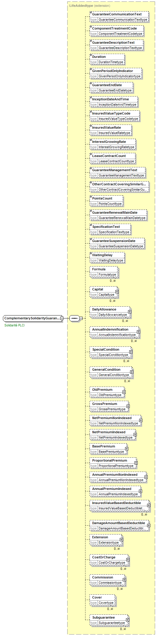| children | GuaranteeCommunicationText ComponentTreatmentCode GuaranteeDescriptionText Duration GivenPeriodOnlyIndicator GuaranteeEndDate InceptionDateAndTime InsuredValueTypeCode InsuredValueRate InterestGrowingRate LeaseContractCount GuaranteeManagementText OtherContractCoveringSimilarGuaranteeIndicator PointsCount GuaranteeRenewalMainDate SpecificationText GuaranteeSuspensionDate WaitingDelay Formula Capital DailyAllowance AnnualIndemnification SpecialCondition GeneralCondition OldPremium GrossPremium NetPremiumNonIndexed NetPremiumIndexed BasePremium ProportionalPremium AnnualPremiumNonIndexed AnnualPremiumIndexed InsuredValueBasedDeductible DamageAmountBasedDeductible Extension CostOrCharge Commission Cover Subguarantee | ||||||||||||||||||