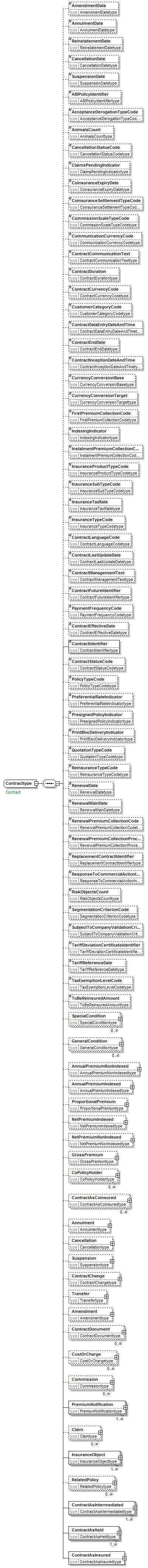 | source | <xsd:complexType name="Contracttype"> <xsd:annotation> <xsd:appinfo source="tb2Semantics">A binding agreement between two or more parties for the doing or not doing of certain things. A contract of insurance is embodied in a written document called the policy.</xsd:appinfo> <xsd:appinfo source="tb2Edifact">CNTRCT</xsd:appinfo> <xsd:documentation source="BusinessTerm" xml:lang="en">Contract</xsd:documentation> <xsd:documentation source="BusinessTerm" xml:lang="nl">Contract</xsd:documentation> <xsd:documentation source="BusinessTerm" xml:lang="fr">Contrat</xsd:documentation> </xsd:annotation> <xsd:sequence> <xsd:element name="AmendmentDate" type="AmendmentDatetype" minOccurs="0"/> <xsd:element name="AnnulmentDate" type="AnnulmentDatetype" minOccurs="0"/> <xsd:element name="ReinstatementDate" type="ReinstatementDatetype" minOccurs="0"/> <xsd:element name="CancellationDate" type="CancellationDatetype" minOccurs="0"/> <xsd:element name="SuspensionDate" type="SuspensionDatetype" minOccurs="0"/> <xsd:element name="ABIPolicyIdentifier" type="ABIPolicyIdentifiertype" minOccurs="0"/> <xsd:element name="AcceptanceDerogationTypeCode" type="AcceptanceDerogationTypeCodetype" minOccurs="0"/> <xsd:element name="AnimalsCount" type="AnimalsCounttype" minOccurs="0"/> <xsd:element name="CancellationStatusCode" type="CancellationStatusCodetype" minOccurs="0"/> <xsd:element name="ClaimsPendingIndicator" type="ClaimsPendingIndicatortype" minOccurs="0"/> <xsd:element name="CoinsuranceExpiryDate" type="CoinsuranceExpiryDatetype" minOccurs="0"/> <xsd:element name="CoinsuranceSettlementTypeCode" type="CoinsuranceSettlementTypeCodetype" minOccurs="0"/> <xsd:element name="CommissionScaleTypeCode" type="CommissionScaleTypeCodetype" minOccurs="0"/> <xsd:element name="CommunicationCurrencyCode" type="CommunicationCurrencyCodetype" minOccurs="0"/> <xsd:element name="ContractCommunicationText" type="ContractCommunicationTexttype" minOccurs="0"/> <xsd:element name="ContractDuration" type="ContractDurationtype" minOccurs="0"/> <xsd:element name="ContractCurrencyCode" type="ContractCurrencyCodetype" minOccurs="0"/> <xsd:element name="CustomerCategoryCode" type="CustomerCategoryCodetype" minOccurs="0"/> <xsd:element name="ContractDataEntryDateAndTime" type="ContractDataEntryDateAndTimetype" minOccurs="0"/> <xsd:element name="ContractEndDate" type="ContractEndDatetype" minOccurs="0"/> <xsd:element name="ContractInceptionDateAndTime" type="ContractInceptionDateAndTimetype" minOccurs="0"/> <xsd:element name="CurrencyConversionBase" type="CurrencyConversionBasetype" minOccurs="0"/> <xsd:element name="CurrencyConversionTarget" type="CurrencyConversionTargettype" minOccurs="0"/> <xsd:element name="FirstPremiumCollectionCode" type="FirstPremiumCollectionCodetype" minOccurs="0"/> <xsd:element name="IndexingIndicator" type="IndexingIndicatortype" minOccurs="0"/> <xsd:element name="InstalmentPremiumCollectionCode" type="InstalmentPremiumCollectionCodetype" minOccurs="0"/> <xsd:element name="InsuranceProductTypeCode" type="InsuranceProductTypeCodetype" minOccurs="0"/> <xsd:element name="InsuranceSubTypeCode" type="InsuranceSubTypeCodetype" minOccurs="0"/> <xsd:element name="InsuranceTaxRate" type="InsuranceTaxRatetype" minOccurs="0"/> <xsd:element name="InsuranceTypeCode" type="InsuranceTypeCodetype" minOccurs="0"/> <xsd:element name="ContractLanguageCode" type="ContractLanguageCodetype" minOccurs="0"/> <xsd:element name="ContractLastUpdateDate" type="ContractLastUpdateDatetype" minOccurs="0"/> <xsd:element name="ContractManagementText" type="ContractManagementTexttype" minOccurs="0"/> <xsd:element name="ContractFutureIdentifier" type="ContractFutureIdentifiertype" minOccurs="0"/> <xsd:element name="PaymentFrequencyCode" type="PaymentFrequencyCodetype" minOccurs="0"/> <xsd:element name="ContractEffectiveDate" type="ContractEffectiveDatetype" minOccurs="0"/> <xsd:element name="ContractIdentifier" type="ContractIdentifiertype"/> <xsd:element name="ContractStatusCode" type="ContractStatusCodetype" minOccurs="0"/> <xsd:element name="PolicyTypeCode" type="PolicyTypeCodetype" minOccurs="0"/> <xsd:element name="PreferentialRateIndicator" type="PreferentialRateIndicatortype" minOccurs="0"/> <xsd:element name="PresignedPolicyIndicator" type="PresignedPolicyIndicatortype" minOccurs="0"/> <xsd:element name="PrintBlocDeliveryIndicator" type="PrintBlocDeliveryIndicatortype" minOccurs="0"/> <xsd:element name="QuotationTypeCode" type="QuotationTypeCodetype" minOccurs="0"/> <xsd:element name="ReinsuranceTypeCode" type="ReinsuranceTypeCodetype" minOccurs="0"/> <xsd:element name="RenewalDate" type="RenewalDatetype" minOccurs="0"/> <xsd:element name="RenewalMainDate" type="RenewalMainDatetype" minOccurs="0"/> <xsd:element name="RenewalPremiumCollectionCode" type="RenewalPremiumCollectionCodetype" minOccurs="0"/> <xsd:element name="RenewalPremiumCollectionProcessCode" type="RenewalPremiumCollectionProcessCodetype" minOccurs="0"/> <xsd:element name="ReplacementContractIdentifier" type="ReplacementContractIdentifiertype" minOccurs="0"/> <xsd:element name="ResponseToCommercialActionIndicator" type="ResponseToCommercialActionIndicatortype" minOccurs="0"/> <xsd:element name="RiskObjectsCount" type="RiskObjectsCounttype" minOccurs="0"/> <xsd:element name="SegmentationCriterionCode" type="SegmentationCriterionCodetype" minOccurs="0"/> <xsd:element name="SubjectToCompanyValidationCriterionIndicator" type="SubjectToCompanyValidationCriterionIndicatortype" minOccurs="0"/> <xsd:element name="TariffDeviationCertificateIdentifier" type="TariffDeviationCertificateIdentifiertype" minOccurs="0"/> <xsd:element name="TariffReferenceDate" type="TariffReferenceDatetype" minOccurs="0"/> <xsd:element name="TaxExemptionLevelCode" type="TaxExemptionLevelCodetype" minOccurs="0"/> <xsd:element name="ToBeReinsuredAmount" type="ToBeReinsuredAmounttype" minOccurs="0"/> <xsd:element name="SpecialCondition" type="SpecialConditiontype" minOccurs="0" maxOccurs="unbounded"/> <x
