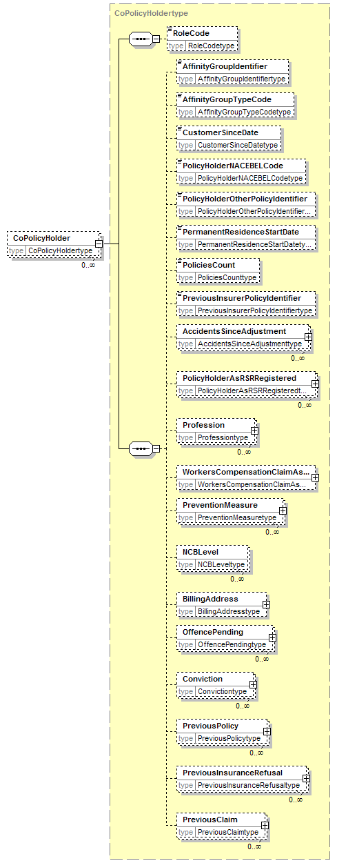 | children | RoleCode AffinityGroupIdentifier AffinityGroupTypeCode CustomerSinceDate PolicyHolderNACEBELCode PolicyHolderOtherPolicyIdentifier PermanentResidenceStartDate PoliciesCount PreviousInsurerPolicyIdentifier AccidentsSinceAdjustment PolicyHolderAsRSRRegistered Profession WorkersCompensationClaimAsPolicyHeld PreventionMeasure NCBLevel BillingAddress OffencePending Conviction PreviousPolicy PreviousInsuranceRefusal PreviousClaim | ||||||||