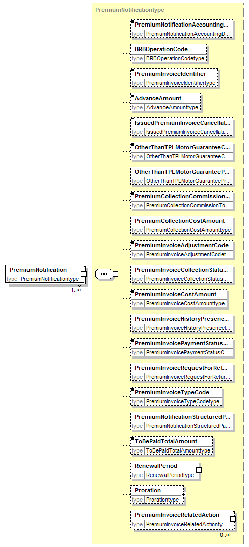 | children | PremiumNotificationAccountingDate BRBOperationCode PremiumInvoiceIdentifier AdvanceAmount IssuedPremiumInvoiceCancellationIndicator OtherThanTPLMotorGuaranteeChargeAndCostAmount OtherThanTPLMotorGuaranteePremiumAmount PremiumCollectionCommissionTotalAmount PremiumCollectionCostAmount PremiumInvoiceAdjustmentCode PremiumInvoiceCollectionStatusCode PremiumInvoiceCostAmount PremiumInvoiceHistoryPresenceIndicator PremiumInvoicePaymentStatusCode PremiumInvoiceRequestForReturnReasonCode PremiumInvoiceTypeCode PremiumNotificationStructuredPaymentReferenceText ToBePaidTotalAmount RenewalPeriod Proration PremiumInvoiceRelatedAction | ||||||||