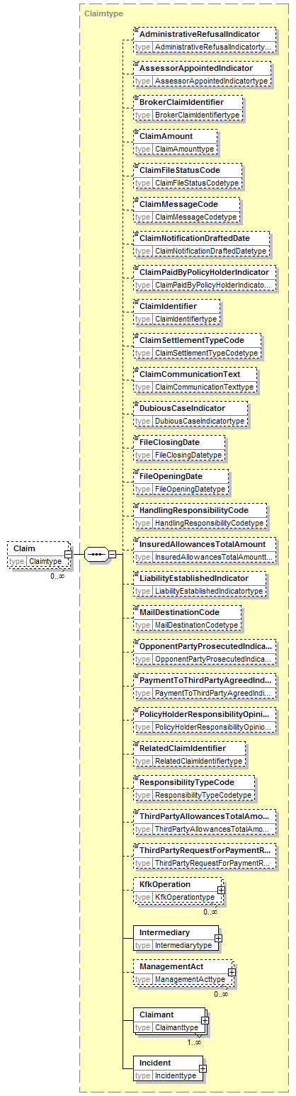 | children | AdministrativeRefusalIndicator AssessorAppointedIndicator BrokerClaimIdentifier ClaimAmount ClaimFileStatusCode ClaimMessageCode ClaimNotificationDraftedDate ClaimPaidByPolicyHolderIndicator ClaimIdentifier ClaimSettlementTypeCode ClaimCommunicationText DubiousCaseIndicator FileClosingDate FileOpeningDate HandlingResponsibilityCode InsuredAllowancesTotalAmount LiabilityEstablishedIndicator MailDestinationCode OpponentPartyProsecutedIndicator PaymentToThirdPartyAgreedIndicator PolicyHolderResponsibilityOpinionText RelatedClaimIdentifier ResponsibilityTypeCode ThirdPartyAllowancesTotalAmount ThirdPartyRequestForPaymentReceivedIndicator KfkOperation Intermediary ManagementAct Claimant Incident | ||||||||