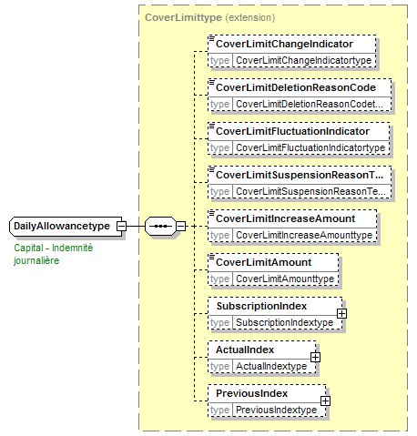 | source | <xsd:complexType name="DailyAllowancetype"> <xsd:annotation> <xsd:appinfo source="tb2Semantics">The amount of the daily allowance (= amount of money given regularly). (Personal insurance)</xsd:appinfo> <xsd:appinfo source="tb2Edifact">(MOA+036)</xsd:appinfo> <xsd:documentation source="BusinessTerm" xml:lang="fr">Capital - Indemnité journalière</xsd:documentation> <xsd:documentation source="BusinessTerm" xml:lang="nl">Kapitaal - Dagvergoeding</xsd:documentation> <xsd:documentation source="BusinessTerm" xml:lang="ge">Kapital - Tagesentschädigung</xsd:documentation> <xsd:documentation source="BusinessTerm" xml:lang="en">Capital - daily allowance</xsd:documentation> <xsd:documentation source="BusinessDefinition" xml:lang="fr">Allocation quotidienne prévue aux conditions particulières.</xsd:documentation> <xsd:documentation source="BusinessDefinition" xml:lang="nl">Dagelijkse toelage welke voorzien is in de bijzondere voorwaarden.</xsd:documentation> <xsd:documentation source="BusinessDefinition" xml:lang="en">Monetary amount</xsd:documentation> </xsd:annotation> <xsd:complexContent> <xsd:extension base="CoverLimittype"/> </xsd:complexContent> </xsd:complexType> |