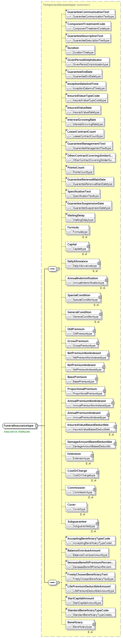 | source | <xsd:complexType name="FuneralInsurancetype"> <xsd:annotation> <xsd:appinfo source="tb2Edifact">(ICD+122)</xsd:appinfo> <xsd:documentation source="BusinessTerm" xml:lang="fr">Assurance obsèques</xsd:documentation> <xsd:documentation source="BusinessTerm" xml:lang="nl">Uitvaartverzekering</xsd:documentation> <xsd:documentation source="BusinessTerm" xml:lang="ge">Exequien Versicherung </xsd:documentation> <xsd:documentation source="BusinessTerm" xml:lang="en">Funeral insurance</xsd:documentation> <xsd:documentation source="BusinessDefinition" xml:lang="fr">Garantie couvrant les frais d'obsèques de l'assuré, par le biais d'une somme convenue à verser ou par le biais de prestations préalablement spécifiées.</xsd:documentation> <xsd:documentation source="BusinessDefinition" xml:lang="nl">Waarborg ter dekking van de kosten voor de uitvaart van de verzekerde, onder de vorm van een financiële tegemoetkoming of van een reeks vooraf afgesproken prestaties.</xsd:documentation> <xsd:documentation source="BusinessDefinition" xml:lang="en">Guarantee - Covering funeral expenses, based on the death of the insured person.</xsd:documentation> </xsd:annotation> <xsd:complexContent> <xsd:extension base="TemporaryDeceasetype"/> </xsd:complexContent> </xsd:complexType> |