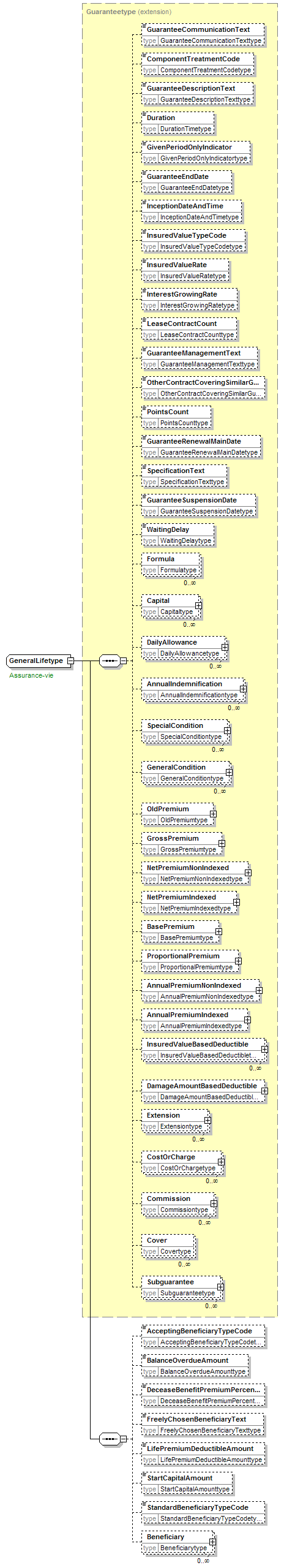 | children | GuaranteeCommunicationText ComponentTreatmentCode GuaranteeDescriptionText Duration GivenPeriodOnlyIndicator GuaranteeEndDate InceptionDateAndTime InsuredValueTypeCode InsuredValueRate InterestGrowingRate LeaseContractCount GuaranteeManagementText OtherContractCoveringSimilarGuaranteeIndicator PointsCount GuaranteeRenewalMainDate SpecificationText GuaranteeSuspensionDate WaitingDelay Formula Capital DailyAllowance AnnualIndemnification SpecialCondition GeneralCondition OldPremium GrossPremium NetPremiumNonIndexed NetPremiumIndexed BasePremium ProportionalPremium AnnualPremiumNonIndexed AnnualPremiumIndexed InsuredValueBasedDeductible DamageAmountBasedDeductible Extension CostOrCharge Commission Cover Subguarantee AcceptingBeneficiaryTypeCode BalanceOverdueAmount DeceaseBenefitPremiumPercentage FreelyChosenBeneficiaryText LifePremiumDeductibleAmount StartCapitalAmount StandardBeneficiaryTypeCode Beneficiary | ||||||||||||||||