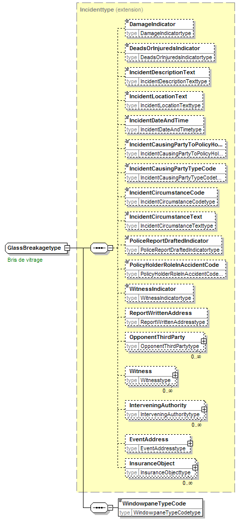 | source | <xsd:complexType name="GlassBreakagetype"> <xsd:annotation> <xsd:appinfo source="tb2Semantics">The breakage of glass.</xsd:appinfo> <xsd:appinfo source="tb2Edifact">(EVT+350)</xsd:appinfo> <xsd:documentation source="BusinessTerm" xml:lang="fr">Bris de vitrage</xsd:documentation> <xsd:documentation source="BusinessTerm" xml:lang="nl">Glasbraak</xsd:documentation> <xsd:documentation source="BusinessTerm" xml:lang="ge">Glasbruch</xsd:documentation> <xsd:documentation source="BusinessTerm" xml:lang="en">Glass breakage</xsd:documentation> <xsd:documentation source="BusinessDefinition" xml:lang="fr">Identifie un événement.<br/>Typiquement des événements dans un contexte sinistres</xsd:documentation> <xsd:documentation source="BusinessDefinition" xml:lang="nl">Identificeert een gebeurtenis.<br/>Men denkt hier in eerste instantie in het kader van de schades.</xsd:documentation> <xsd:documentation source="BusinessDefinition" xml:lang="en">Event</xsd:documentation> </xsd:annotation> <xsd:complexContent> <xsd:extension base="Incidenttype"> <xsd:sequence> <xsd:element name="WindowpaneTypeCode" type="WindowpaneTypeCodetype"/> </xsd:sequence> </xsd:extension> </xsd:complexContent> </xsd:complexType> |
