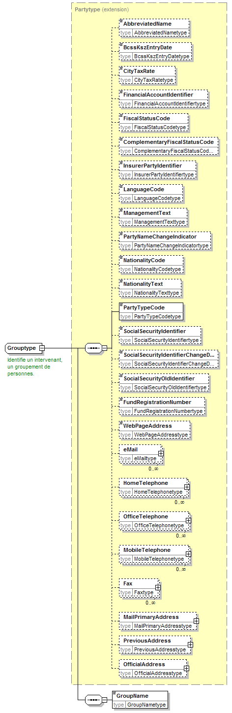 | children | AbbreviatedName BcssKszEntryDate CityTaxRate FinancialAccountIdentifier FiscalStatusCode ComplementaryFiscalStatusCode InsurerPartyIdentifier LanguageCode ManagementText PartyNameChangeIndicator NationalityCode NationalityText PartyTypeCode SocialSecurityIdentifier SocialSecurityIdentifierChangeDate SocialSecurityOldIdentifier FundRegistrationNumber WebPageAddress eMail HomeTelephone OfficeTelephone MobileTelephone Fax MailPrimaryAddress PreviousAddress OfficialAddress GroupName | ||||||||||||||||