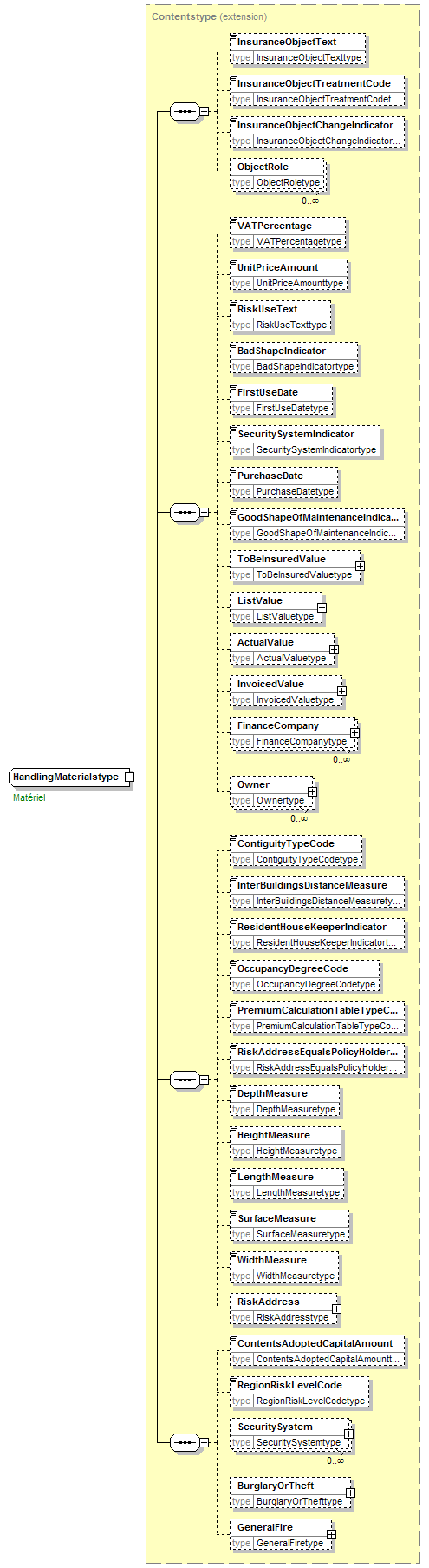 | source | <xsd:complexType name="HandlingMaterialstype"> <xsd:annotation> <xsd:appinfo source="tb2Semantics">Utilities and equipment.</xsd:appinfo> <xsd:appinfo source="tb2Edifact">(ROD+014)</xsd:appinfo> <xsd:documentation source="BusinessTerm" xml:lang="fr">Matériel</xsd:documentation> <xsd:documentation source="BusinessTerm" xml:lang="nl">Materieel</xsd:documentation> <xsd:documentation source="BusinessTerm" xml:lang="ge">Ausrüstung</xsd:documentation> <xsd:documentation source="BusinessTerm" xml:lang="en">Equipment</xsd:documentation> <xsd:documentation source="BusinessDefinition" xml:lang="fr">Ensemble de biens mobiliers à usage professionnel (comptoir, table médecin, siège dentiste, ...).</xsd:documentation> <xsd:documentation source="BusinessDefinition" xml:lang="nl">Geheel van roerende goederen voor professioneel gebruik (toonbank, dokterstafel, tandartsstoel, ... ).</xsd:documentation> <xsd:documentation source="BusinessDefinition" xml:lang="en">Risk Object - Handling materials - Equipment for professional usage.</xsd:documentation> </xsd:annotation> <xsd:complexContent> <xsd:extension base="Contentstype"/> </xsd:complexContent> </xsd:complexType> |