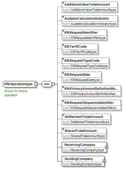 | source | <xsd:complexType name="KfkOperationtype"> <xsd:annotation> <xsd:appinfo source="tb2Semantics">A transaction, activity in relationship to and in accordance with the specifications of the knock-for-knock convention.</xsd:appinfo> <xsd:appinfo source="tb2Edifact">CLASET</xsd:appinfo> <xsd:documentation source="BusinessTerm" xml:lang="en">Knock for knock operation</xsd:documentation> <xsd:documentation source="BusinessTerm" xml:lang="nl">Directe regeling (RDR)</xsd:documentation> <xsd:documentation source="BusinessTerm" xml:lang="fr">Règlement direct (RDR)</xsd:documentation> </xsd:annotation> <xsd:sequence> <xsd:element name="AdditionsValueTotalAmount" type="AdditionsValueTotalAmounttype" minOccurs="0"/> <xsd:element name="AudatexCalculationIndicator" type="AudatexCalculationIndicatortype" minOccurs="0"/> <xsd:element name="KfkRequestIdentifier" type="KfkRequestIdentifiertype" minOccurs="0"/> <xsd:element name="KfkTariffCode" type="KfkTariffCodetype" minOccurs="0"/> <xsd:element name="KfkRequestTypeCode" type="KfkRequestTypeCodetype" minOccurs="0"/> <xsd:element name="KfkRequestDate" type="KfkRequestDatetype" minOccurs="0"/> <xsd:element name="KfkPrimaryAmountDefinitionMannerCode" type="KfkPrimaryAmountDefinitionMannerCodetype" minOccurs="0"/> <xsd:element name="KfkRequestSequenceIdentifier" type="KfkRequestSequenceIdentifiertype" minOccurs="0"/> <xsd:element name="SettlementTotalAmount" type="SettlementTotalAmounttype" minOccurs="0"/> <xsd:element name="SharedTotalAmount" type="SharedTotalAmounttype" minOccurs="0"/> <xsd:element name="ReceivingCompany" type="ReceivingCompanytype"/> <xsd:element name="SendingCompany" type="SendingCompanytype"/> </xsd:sequence> </xsd:complexType> |