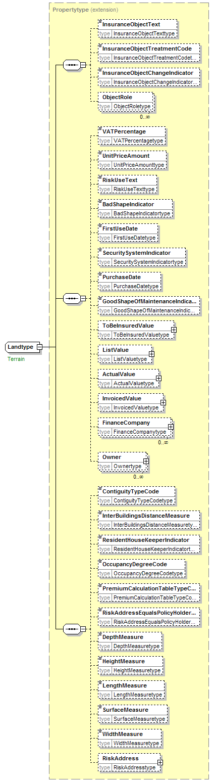 | children | InsuranceObjectText InsuranceObjectTreatmentCode InsuranceObjectChangeIndicator ObjectRole VATPercentage UnitPriceAmount RiskUseText BadShapeIndicator FirstUseDate SecuritySystemIndicator PurchaseDate GoodShapeOfMaintenanceIndicator ToBeInsuredValue ListValue ActualValue InvoicedValue FinanceCompany Owner ContiguityTypeCode InterBuildingsDistanceMeasure ResidentHouseKeeperIndicator OccupancyDegreeCode PremiumCalculationTableTypeCode RiskAddressEqualsPolicyHolderAddressIndicator DepthMeasure HeightMeasure LengthMeasure SurfaceMeasure WidthMeasure RiskAddress | ||||||||||||||||||
