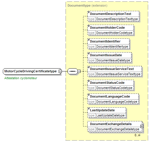 | source | <xsd:complexType name="MotorCycleDrivingCertificatetype"> <xsd:annotation> <xsd:appinfo source="tb2Semantics">Document issued by an official body certifying that the party has the ability to ride a motorcycle.</xsd:appinfo> <xsd:appinfo source="tb2Edifact">(DOC+012)</xsd:appinfo> <xsd:documentation source="BusinessTerm" xml:lang="fr">Attestation cyclomoteur</xsd:documentation> <xsd:documentation source="BusinessTerm" xml:lang="nl">Attest motorfiets</xsd:documentation> <xsd:documentation source="BusinessTerm" xml:lang="ge">Motorradbescheinigung</xsd:documentation> <xsd:documentation source="BusinessTerm" xml:lang="en">Motorcycle certificate</xsd:documentation> <xsd:documentation source="BusinessDefinition" xml:lang="fr">Attestation émise par une instance officielle que confirme le droit de conduite d'un cyclomoteur.</xsd:documentation> <xsd:documentation source="BusinessDefinition" xml:lang="nl">Attest, door een officiële instantie uitgeschreven, dat het recht tot besturen van een motorfiets erkent.</xsd:documentation> <xsd:documentation source="BusinessDefinition" xml:lang="en">Document</xsd:documentation> </xsd:annotation> <xsd:complexContent> <xsd:extension base="Documenttype"/> </xsd:complexContent> </xsd:complexType> |