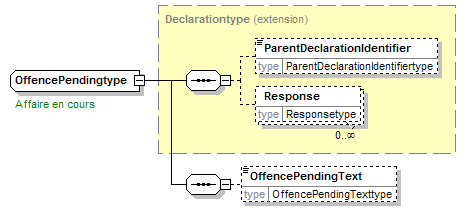 | source | <xsd:complexType name="OffencePendingtype"> <xsd:annotation> <xsd:appinfo source="tb2Semantics">An act punishable by law; usually considered an evil act.</xsd:appinfo> <xsd:appinfo source="tb2Edifact">(QRS+5V06)</xsd:appinfo> <xsd:documentation source="BusinessTerm" xml:lang="fr">Affaire en cours</xsd:documentation> <xsd:documentation source="BusinessTerm" xml:lang="nl">Rechtszaak hangende</xsd:documentation> <xsd:documentation source="BusinessTerm" xml:lang="ge">Laufendes Verfahren</xsd:documentation> <xsd:documentation source="BusinessTerm" xml:lang="en">Case pending</xsd:documentation> <xsd:documentation source="BusinessDefinition" xml:lang="fr">Identifie une déclaration.</xsd:documentation> <xsd:documentation source="BusinessDefinition" xml:lang="nl">Identificeert een verklaring.</xsd:documentation> <xsd:documentation source="BusinessDefinition" xml:lang="en">Declaration</xsd:documentation> </xsd:annotation> <xsd:complexContent> <xsd:extension base="Declarationtype"> <xsd:sequence> <xsd:element name="OffencePendingText" type="OffencePendingTexttype" minOccurs="0"/> </xsd:sequence> </xsd:extension> </xsd:complexContent> </xsd:complexType> |