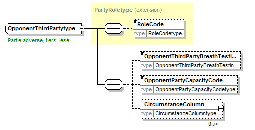 | source | <xsd:complexType name="OpponentThirdPartytype"> <xsd:annotation> <xsd:appinfo source="tb2Semantics">A party that is involved in an incident and that is not one of the two parties, insured and insurer. </xsd:appinfo> <xsd:appinfo source="tb2Edifact">(PTY+020)</xsd:appinfo> <xsd:documentation source="BusinessTerm" xml:lang="fr">Partie adverse, tiers, lésé</xsd:documentation> <xsd:documentation source="BusinessTerm" xml:lang="nl">Tegenpartij, derde, schadelijder</xsd:documentation> <xsd:documentation source="BusinessTerm" xml:lang="ge">Gegenpartei</xsd:documentation> <xsd:documentation source="BusinessTerm" xml:lang="en">Opponent third party</xsd:documentation> <xsd:documentation source="BusinessDefinition" xml:lang="fr">Regroupe les notions tiers lésé, partie adverse.Toute personne impliquée dans un sinistre et non définie au contrat / non considérée comme asurée dans le contrat.</xsd:documentation> <xsd:documentation source="BusinessDefinition" xml:lang="nl">Groepeert de noties benadeelde derde, tegenpartij.Iedere persoon betrokken in een schadegeval en niet aangeduid in het contract.</xsd:documentation> <xsd:documentation source="BusinessDefinition" xml:lang="en">Party - A party that is involved in an incident and that is not one of the two parties, insured and insurer. </xsd:documentation> </xsd:annotation> <xsd:complexContent> <xsd:extension base="PartyRoletype"> <xsd:sequence> <xsd:element name="OpponentThirdPartyBreathTestIndicator" type="OpponentThirdPartyBreathTestIndicatortype" minOccurs="0"/> <xsd:element name="OpponentPartyCapacityCode" type="OpponentPartyCapacityCodetype" minOccurs="0"/> <xsd:element name="CircumstanceColumn" type="CircumstanceColumntype" minOccurs="0" maxOccurs="unbounded"/> </xsd:sequence> </xsd:extension> </xsd:complexContent> </xsd:complexType> |