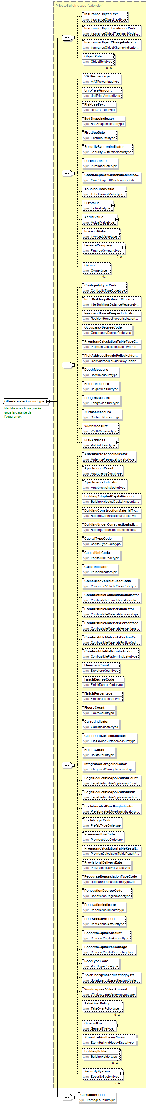| source | <xsd:complexType name="OtherPrivateBuildingtype"> <xsd:annotation> <xsd:appinfo source="tb2Semantics">A construction that (normally) has a roof and walls which is for private use other than occupation (residency) or garaging vehicles.</xsd:appinfo> <xsd:appinfo source="tb2Edifact">(ROD)</xsd:appinfo> <xsd:documentation source="BusinessDefinition" xml:lang="fr">Identifie une chose placée sous la garantie de l'assurance.</xsd:documentation> <xsd:documentation source="BusinessDefinition" xml:lang="nl">Identificeert een zaak, onderwerp van waarborg in een verzekering.</xsd:documentation> <xsd:documentation source="BusinessDefinition" xml:lang="en">Risk Object - A construction that (normally) has a roof and walls which is for private use other than occupation (residency) or garaging vehicles.</xsd:documentation> <xsd:documentation source="BusinessTerm" xml:lang="en">Other private building</xsd:documentation> <xsd:documentation source="BusinessTerm" xml:lang="nl">Privaat gebouw, andere</xsd:documentation> <xsd:documentation source="BusinessTerm" xml:lang="fr">Bâtiment privé, autre</xsd:documentation> </xsd:annotation> <xsd:complexContent> <xsd:extension base="PrivateBuildingtype"> <xsd:sequence> <xsd:element name="CarriagesCount" type="CarriagesCounttype" minOccurs="0"/> </xsd:sequence> </xsd:extension> </xsd:complexContent> </xsd:complexType> |