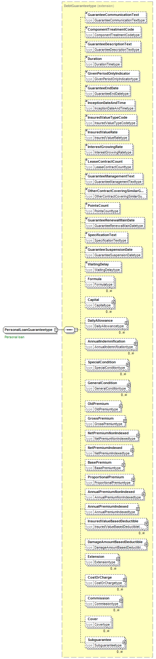 | children | GuaranteeCommunicationText ComponentTreatmentCode GuaranteeDescriptionText Duration GivenPeriodOnlyIndicator GuaranteeEndDate InceptionDateAndTime InsuredValueTypeCode InsuredValueRate InterestGrowingRate LeaseContractCount GuaranteeManagementText OtherContractCoveringSimilarGuaranteeIndicator PointsCount GuaranteeRenewalMainDate SpecificationText GuaranteeSuspensionDate WaitingDelay Formula Capital DailyAllowance AnnualIndemnification SpecialCondition GeneralCondition OldPremium GrossPremium NetPremiumNonIndexed NetPremiumIndexed BasePremium ProportionalPremium AnnualPremiumNonIndexed AnnualPremiumIndexed InsuredValueBasedDeductible DamageAmountBasedDeductible Extension CostOrCharge Commission Cover Subguarantee | ||||||||||||||||