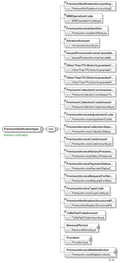 | children | PremiumNotificationAccountingDate BRBOperationCode PremiumInvoiceIdentifier AdvanceAmount IssuedPremiumInvoiceCancellationIndicator OtherThanTPLMotorGuaranteeChargeAndCostAmount OtherThanTPLMotorGuaranteePremiumAmount PremiumCollectionCommissionTotalAmount PremiumCollectionCostAmount PremiumInvoiceAdjustmentCode PremiumInvoiceCollectionStatusCode PremiumInvoiceCostAmount PremiumInvoiceHistoryPresenceIndicator PremiumInvoicePaymentStatusCode PremiumInvoiceRequestForReturnReasonCode PremiumInvoiceTypeCode PremiumNotificationStructuredPaymentReferenceText ToBePaidTotalAmount RenewalPeriod Proration PremiumInvoiceRelatedAction | ||||||||