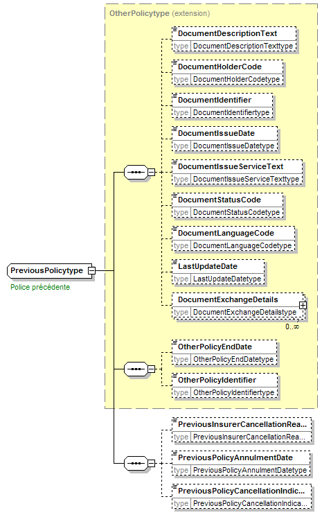 | children | DocumentDescriptionText DocumentHolderCode DocumentIdentifier DocumentIssueDate DocumentIssueServiceText DocumentStatusCode DocumentLanguageCode LastUpdateDate DocumentExchangeDetails OtherPolicyEndDate OtherPolicyIdentifier PreviousInsurerCancellationReasonCode PreviousPolicyAnnulmentDate PreviousPolicyCancellationIndicator | ||||||||||||||||||