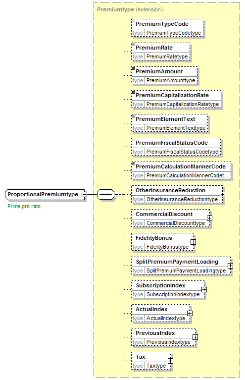| source | <xsd:complexType name="ProportionalPremiumtype"> <xsd:annotation> <xsd:appinfo source="tb2Semantics">The premium derived from the net premium by applying a calculation for a proportional period of time. </xsd:appinfo> <xsd:appinfo source="tb2Edifact">(MOA+045)</xsd:appinfo> <xsd:documentation source="BusinessTerm" xml:lang="fr">Prime pro rato</xsd:documentation> <xsd:documentation source="BusinessTerm" xml:lang="nl">Pro rato premie</xsd:documentation> <xsd:documentation source="BusinessTerm" xml:lang="ge">Verhältnis Prämie</xsd:documentation> <xsd:documentation source="BusinessTerm" xml:lang="en">Pro rata premium</xsd:documentation> <xsd:documentation source="BusinessDefinition" xml:lang="fr">La prime calculée prorata temporis à partir de la date d'effet du contrat d'assurance ou de l'avenant jusqu'à la prochaine échéance.</xsd:documentation> <xsd:documentation source="BusinessDefinition" xml:lang="nl">De premie die pro rata temporis wordt berekend vanaf de datum waarop de verzekeringsovereenkomst of het bijvoegsel uitwerking heeft gekregen tot op de volgende vervaldag.</xsd:documentation> <xsd:documentation source="BusinessDefinition" xml:lang="en">Monetary amount - The premium derived from the net premium by applying a calculation for a proportional period of time. </xsd:documentation> </xsd:annotation> <xsd:complexContent> <xsd:extension base="Premiumtype"/> </xsd:complexContent> </xsd:complexType> |
