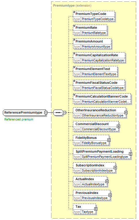 | children | PremiumTypeCode PremiumRate PremiumAmount PremiumCapitalizationRate PremiumElementText PremiumFiscalStatusCode PremiumCalculationMannerCode OtherInsuranceReduction CommercialDiscount FidelityBonus SplitPremiumPaymentLoading SubscriptionIndex ActualIndex PreviousIndex Tax | ||||||||