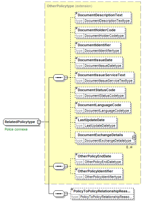 | source | <xsd:complexType name="RelatedPolicytype"> <xsd:annotation> <xsd:appinfo source="tb2Semantics">Other policy of the policyholder with the same insurer that in any kind influences the policy subject of this message.</xsd:appinfo> <xsd:appinfo source="tb2Edifact">(DOC+001)</xsd:appinfo> <xsd:documentation source="BusinessTerm" xml:lang="fr">Police connexe</xsd:documentation> <xsd:documentation source="BusinessTerm" xml:lang="nl">Connexe polis</xsd:documentation> <xsd:documentation source="BusinessTerm" xml:lang="ge">Verwandte Police</xsd:documentation> <xsd:documentation source="BusinessTerm" xml:lang="en">Related policy</xsd:documentation> <xsd:documentation source="BusinessDefinition" xml:lang="fr">Autre police du preneur avec le même assureur et qui influence d'une part ou d'autre la police sujet de ce message.</xsd:documentation> <xsd:documentation source="BusinessDefinition" xml:lang="nl">Andere polis van de verzekeringsnemer bij dezelfde verzekeraar die in op welke wijze ook, de polis onderwep van dit bericht beïnvloedt.</xsd:documentation> <xsd:documentation source="BusinessDefinition" xml:lang="en">Document</xsd:documentation> </xsd:annotation> <xsd:complexContent> <xsd:extension base="OtherPolicytype"> <xsd:sequence> <xsd:element name="PolicyToPolicyRelationshipReasonCode" type="PolicyToPolicyRelationshipReasonCodetype" minOccurs="0"/> </xsd:sequence> </xsd:extension> </xsd:complexContent> </xsd:complexType> |