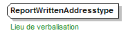 | source | <xsd:complexType name="ReportWrittenAddresstype"> <xsd:annotation> <xsd:appinfo source="tb2Semantics">Structured description by means of street, house number, etc. of the place where the report about an incident is written.</xsd:appinfo> <xsd:appinfo source="tb2Edifact">(ADR+013)</xsd:appinfo> <xsd:documentation source="BusinessTerm" xml:lang="fr">Lieu de verbalisation</xsd:documentation> <xsd:documentation source="BusinessTerm" xml:lang="nl">Plaats van verbalisering</xsd:documentation> <xsd:documentation source="BusinessTerm" xml:lang="ge">Ort wo das Protokoll aufgesetzt ist</xsd:documentation> <xsd:documentation source="BusinessTerm" xml:lang="en">Place where the police report is made</xsd:documentation> <xsd:documentation source="BusinessDefinition" xml:lang="fr">Description structurée sous forme de rue, ..., code postal, ... du lieu où un procès-verbal est dressé.</xsd:documentation> <xsd:documentation source="BusinessDefinition" xml:lang="nl">Gestructureerde beschrijving onder de vorm van straat, ...,postnummer, ... van de plaats waar een proces-verbaal is opgemaakt.</xsd:documentation> <xsd:documentation source="BusinessDefinition" xml:lang="en">Address</xsd:documentation> </xsd:annotation> </xsd:complexType> |