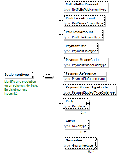 | source | <xsd:complexType name="Settlementtype"> <xsd:annotation> <xsd:appinfo source="tb2Semantics">An agreement on or payment made as indemnity of a loss. It connotes an agreement between both parties to the contract as to the amount and method of payment.</xsd:appinfo> <xsd:appinfo source="tb2Edifact">(PAT)</xsd:appinfo> <xsd:documentation source="BusinessDefinition" xml:lang="fr">Identifie une prestation ou un paiement de frais. En sinistres, une indemnité.</xsd:documentation> <xsd:documentation source="BusinessDefinition" xml:lang="nl">Identificeert een uitkering of een betaling van kosten. In schade, een vergoeding.</xsd:documentation> <xsd:documentation source="BusinessDefinition" xml:lang="en">Settlement - An agreement on or payment made as indemnity of a loss. It connotes an agreement between both parties to the contract as to the amount and method of payment.</xsd:documentation> <xsd:documentation source="BusinessTerm" xml:lang="en">Settlement</xsd:documentation> <xsd:documentation source="BusinessTerm" xml:lang="nl">Regeling (schade)</xsd:documentation> <xsd:documentation source="BusinessTerm" xml:lang="fr">Réglement (de sinistre)</xsd:documentation> </xsd:annotation> <xsd:sequence> <xsd:element name="NotToBePaidAmount" type="NotToBePaidAmounttype" minOccurs="0"/> <xsd:element name="PaidGrossAmount" type="PaidGrossAmounttype" minOccurs="0"/> <xsd:element name="PaidTotalAmount" type="PaidTotalAmounttype" minOccurs="0"/> <xsd:element name="PaymentDate" type="PaymentDatetype" minOccurs="0"/> <xsd:element name="PaymentMeansCode" type="PaymentMeansCodetype" minOccurs="0"/> <xsd:element name="PaymentReference" type="PaymentReferencetype" minOccurs="0"/> <xsd:element name="PaymentSubjectTypeCode" type="PaymentSubjectTypeCodetype" minOccurs="0"/> <xsd:element name="Party" type="Partytype" minOccurs="0" maxOccurs="unbounded"/> <xsd:element name="Cover" type="Covertype" minOccurs="0" maxOccurs="unbounded"/> <xsd:element name="Guarantee" type="Guaranteetype" minOccurs="0" maxOccurs="unbounded"/> </xsd:sequence> </xsd:complexType> |