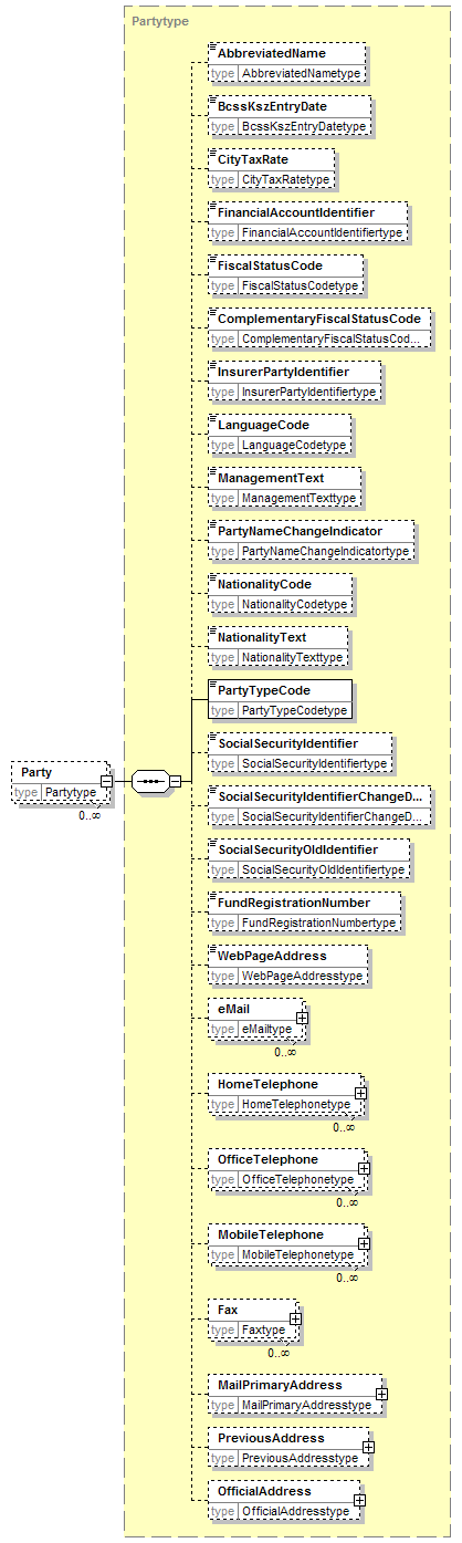 | children | AbbreviatedName BcssKszEntryDate CityTaxRate FinancialAccountIdentifier FiscalStatusCode ComplementaryFiscalStatusCode InsurerPartyIdentifier LanguageCode ManagementText PartyNameChangeIndicator NationalityCode NationalityText PartyTypeCode SocialSecurityIdentifier SocialSecurityIdentifierChangeDate SocialSecurityOldIdentifier FundRegistrationNumber WebPageAddress eMail HomeTelephone OfficeTelephone MobileTelephone Fax MailPrimaryAddress PreviousAddress OfficialAddress | ||||||||