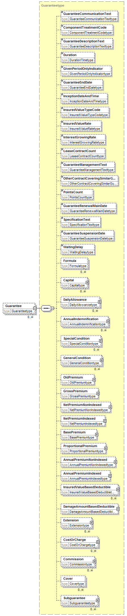 | children | GuaranteeCommunicationText ComponentTreatmentCode GuaranteeDescriptionText Duration GivenPeriodOnlyIndicator GuaranteeEndDate InceptionDateAndTime InsuredValueTypeCode InsuredValueRate InterestGrowingRate LeaseContractCount GuaranteeManagementText OtherContractCoveringSimilarGuaranteeIndicator PointsCount GuaranteeRenewalMainDate SpecificationText GuaranteeSuspensionDate WaitingDelay Formula Capital DailyAllowance AnnualIndemnification SpecialCondition GeneralCondition OldPremium GrossPremium NetPremiumNonIndexed NetPremiumIndexed BasePremium ProportionalPremium AnnualPremiumNonIndexed AnnualPremiumIndexed InsuredValueBasedDeductible DamageAmountBasedDeductible Extension CostOrCharge Commission Cover Subguarantee | ||||||||