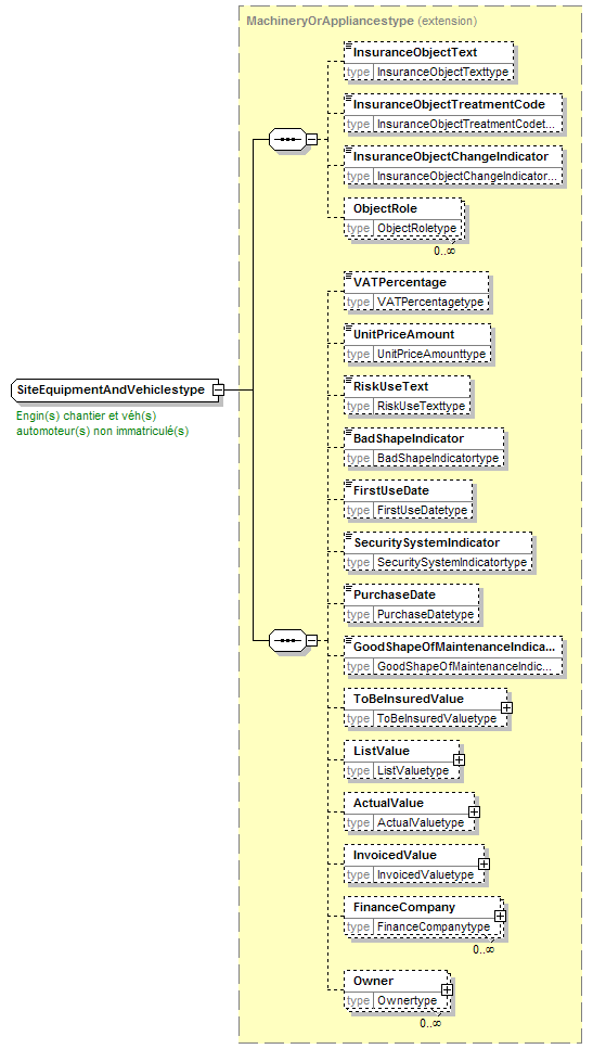 | source | <xsd:complexType name="SiteEquipmentAndVehiclestype"> <xsd:annotation> <xsd:appinfo source="tb2Semantics">Construction site equipment, machinery and non-registered vehicles.</xsd:appinfo> <xsd:appinfo source="tb2Edifact">(ROD+121)</xsd:appinfo> <xsd:documentation source="BusinessTerm" xml:lang="fr">Engin(s) chantier et véh(s) automoteur(s) non immatriculé(s)</xsd:documentation> <xsd:documentation source="BusinessTerm" xml:lang="nl">Werfmateriaal en niet-ingeschreven gemotoriseerde vtgn</xsd:documentation> <xsd:documentation source="BusinessTerm" xml:lang="ge">Maschinen und Geräte au dem Baugelände</xsd:documentation> <xsd:documentation source="BusinessTerm" xml:lang="en">Construction site engines and vehicles</xsd:documentation> <xsd:documentation source="BusinessDefinition" xml:lang="fr">Engins, équipement et véhicules de chantier non registrés</xsd:documentation> <xsd:documentation source="BusinessDefinition" xml:lang="nl">Machines, uitrusting en niet ingeschreven werfvoertuigen</xsd:documentation> <xsd:documentation source="BusinessDefinition" xml:lang="en">Risk Object - Construction site equipment, machinery and non registered vehicles.</xsd:documentation> </xsd:annotation> <xsd:complexContent> <xsd:extension base="MachineryOrAppliancestype"/> </xsd:complexContent> </xsd:complexType> |