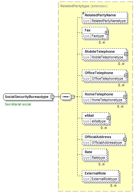 | source | <xsd:complexType name="SocialSecurityBureautype"> <xsd:annotation> <xsd:appinfo source="tb2Semantics">Social Security = Any government program which provides economic security for portions of the public, eg Social Insurance, Public Assistance, Family Allowances, etc.</xsd:appinfo> <xsd:appinfo source="tb2Edifact">(RPT+314)</xsd:appinfo> <xsd:documentation source="BusinessTerm" xml:lang="fr">Secrétariat social</xsd:documentation> <xsd:documentation source="BusinessTerm" xml:lang="nl">Sociaal secretariaat</xsd:documentation> <xsd:documentation source="BusinessTerm" xml:lang="ge">Sozial Sekretariat</xsd:documentation> <xsd:documentation source="BusinessTerm" xml:lang="en">Social Secretariat</xsd:documentation> <xsd:documentation source="BusinessDefinition" xml:lang="fr">Identifie une personne, physique ou morale, qui est en rapport avec l'intervenant. La relation est exprimée de cette personne vers l'intervenant.</xsd:documentation> <xsd:documentation source="BusinessDefinition" xml:lang="nl">Identificeert een persoon, natuurlijke persoon of rechtspersoon, die met de betrokkene een relatie heeft. De relatie wordt uitgedrukt van deze persoon naar de betrokkene.</xsd:documentation> <xsd:documentation source="BusinessDefinition" xml:lang="en">Related party - Social Security = Any government program which provides economic security for portions of the public, eg Social Insurance, Public Assistance, Family Allowances, etc.</xsd:documentation> </xsd:annotation> <xsd:complexContent> <xsd:extension base="RelatedPartytype"/> </xsd:complexContent> </xsd:complexType> |