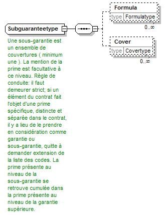 | source | <xsd:complexType name="Subguaranteetype"> <xsd:annotation> <xsd:appinfo source="tb2Semantics">A series of coverages, minimal one. Stating premium is optional.</xsd:appinfo> <xsd:appinfo source="tb2Edifact">(ISD)</xsd:appinfo> <xsd:documentation source="BusinessDefinition" xml:lang="fr">Une sous-garantie est un ensemble de couvertures ( minimum une ). La mention de la prime est facultative à ce niveau. Règle de conduite: il faut demeurer strict; si un élément du contrat fait l'objet d'une prime spécifique, distincte et séparée dans le contrat, il y a lieu de le prendre en considération comme garantie ou sous-garantie, quitte à demander extension de la liste des codes. La prime présente au niveau de la sous-garantie se retrouve cumulée dans la prime présente au niveau de la garantie supérieure.</xsd:documentation> <xsd:documentation source="BusinessDefinition" xml:lang="nl">Een onderwaarborg is een verzameling van dekkingen ( minimum één ). Een vermelding van premies is facultatief op dit niveau. Best practices : consequent blijven; indien een onderdeel van het contract een specifieke, afzonderlijke en onderscheidende premie oplevert, dan moet dit onderdeel als waarborg of onderwaarborg beschreven worden, eventueel moet dus een uitbreiding van de waardenlijst bekomen worden. De premie, aanwezig op het niveau van de onderwaarborg, komt ook voor op het niveau van de bovenliggende waarborg, gecumuleerd zijnde in de daar weergegeven premie.</xsd:documentation> <xsd:documentation source="BusinessDefinition" xml:lang="en">Subguarantee - A series of coverages, minimal one. Stating premium is optional.</xsd:documentation> <xsd:documentation source="BusinessTerm" xml:lang="en">Subguarantee</xsd:documentation> <xsd:documentation source="BusinessTerm" xml:lang="nl">Sub-waarborg</xsd:documentation> <xsd:documentation source="BusinessTerm" xml:lang="fr">Sous-garantie</xsd:documentation> </xsd:annotation> <xsd:sequence> <xsd:element name="Formula" type="Formulatype" minOccurs="0" maxOccurs="unbounded"/> <xsd:element name="Cover" type="Covertype" minOccurs="0" maxOccurs="unbounded"/> </xsd:sequence> </xsd:complexType> |