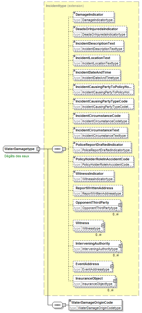 | source | <xsd:complexType name="WaterDamagetype"> <xsd:annotation> <xsd:appinfo source="tb2Semantics">Damaged caused by water.</xsd:appinfo> <xsd:appinfo source="tb2Edifact">(EVT+340)</xsd:appinfo> <xsd:documentation source="BusinessTerm" xml:lang="fr">Dégâts des eaux</xsd:documentation> <xsd:documentation source="BusinessTerm" xml:lang="nl">Waterschade</xsd:documentation> <xsd:documentation source="BusinessTerm" xml:lang="ge">Wasserschäden</xsd:documentation> <xsd:documentation source="BusinessTerm" xml:lang="en">Water damage</xsd:documentation> <xsd:documentation source="BusinessDefinition" xml:lang="fr">Identifie un événement.<br/>Typiquement des événements dans un contexte sinistres</xsd:documentation> <xsd:documentation source="BusinessDefinition" xml:lang="nl">Identificeert een gebeurtenis.<br/>Men denkt hier in eerste instantie in het kader van de schades.</xsd:documentation> <xsd:documentation source="BusinessDefinition" xml:lang="en">Event</xsd:documentation> </xsd:annotation> <xsd:complexContent> <xsd:extension base="Incidenttype"> <xsd:sequence> <xsd:element name="WaterDamageOriginCode" type="WaterDamageOriginCodetype"/> </xsd:sequence> </xsd:extension> </xsd:complexContent> </xsd:complexType> |