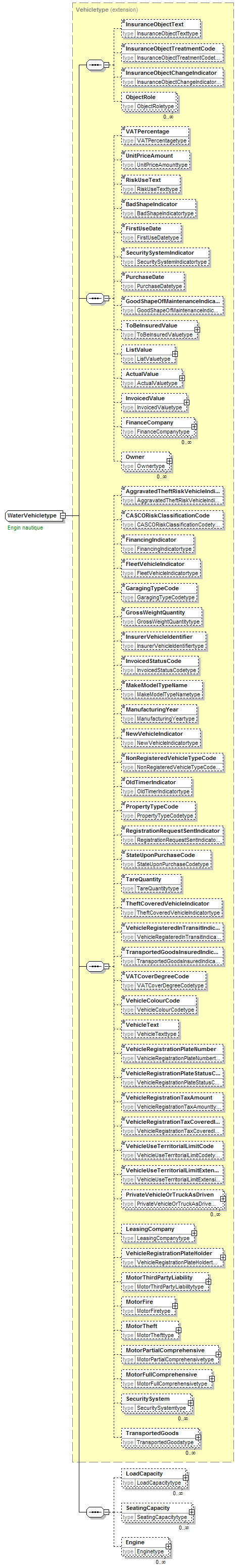 | source | <xsd:complexType name="WaterVehicletype"> <xsd:annotation> <xsd:appinfo source="tb2Semantics">A conveyance that transports people or objects over water.</xsd:appinfo> <xsd:appinfo source="tb2Edifact">(ROD+003)</xsd:appinfo> <xsd:documentation source="BusinessTerm" xml:lang="fr">Engin nautique</xsd:documentation> <xsd:documentation source="BusinessTerm" xml:lang="nl">Vaartuig</xsd:documentation> <xsd:documentation source="BusinessTerm" xml:lang="ge">Wasserfahrzeug</xsd:documentation> <xsd:documentation source="BusinessTerm" xml:lang="en">Vessel</xsd:documentation> <xsd:documentation source="BusinessDefinition" xml:lang="fr">Engin utilisé pour un déplacement de personnes et ou d’objets sur ou sous l’eau.</xsd:documentation> <xsd:documentation source="BusinessDefinition" xml:lang="nl">Tuig dat aangewend wordt voor de verplaatsing van personen op of onder water.</xsd:documentation> <xsd:documentation source="BusinessDefinition" xml:lang="en">Risk Object - A conveyance that transports people or objects over water.</xsd:documentation> </xsd:annotation> <xsd:complexContent> <xsd:extension base="Vehicletype"> <xsd:sequence> <xsd:element name="LoadCapacity" type="LoadCapacitytype" minOccurs="0" maxOccurs="unbounded"/> <xsd:element name="SeatingCapacity" type="SeatingCapacitytype" minOccurs="0" maxOccurs="unbounded"/> <xsd:element name="Engine" type="Enginetype" minOccurs="0" maxOccurs="unbounded"/> </xsd:sequence> </xsd:extension> </xsd:complexContent> </xsd:complexType> |