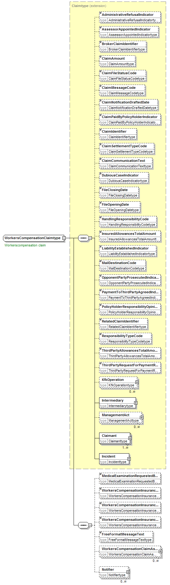 | children | AdministrativeRefusalIndicator AssessorAppointedIndicator BrokerClaimIdentifier ClaimAmount ClaimFileStatusCode ClaimMessageCode ClaimNotificationDraftedDate ClaimPaidByPolicyHolderIndicator ClaimIdentifier ClaimSettlementTypeCode ClaimCommunicationText DubiousCaseIndicator FileClosingDate FileOpeningDate HandlingResponsibilityCode InsuredAllowancesTotalAmount LiabilityEstablishedIndicator MailDestinationCode OpponentPartyProsecutedIndicator PaymentToThirdPartyAgreedIndicator PolicyHolderResponsibilityOpinionText RelatedClaimIdentifier ResponsibilityTypeCode ThirdPartyAllowancesTotalAmount ThirdPartyRequestForPaymentReceivedIndicator KfkOperation Intermediary ManagementAct Claimant Incident MedicalExaminationRequestedByEmployerIndicator WorkersCompensationInsuranceSystemIdentifier WorkersCompensationInsuranceCardYear WorkersCompensationInsuranceCardIdentifier FreeFormatMessageText WorkersCompensationClaimAsPolicyHeld Notifier | ||||||||||