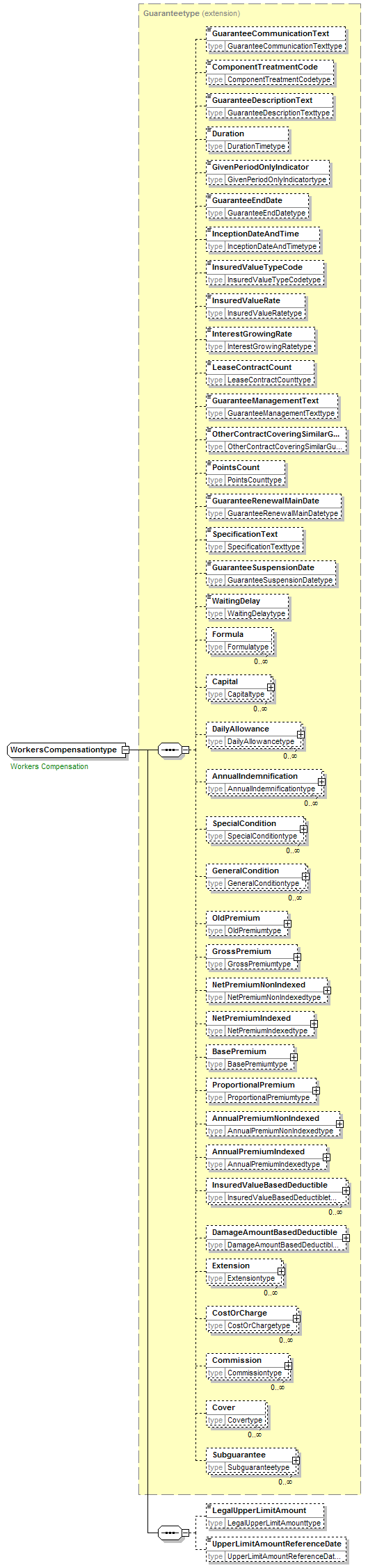 | children | GuaranteeCommunicationText ComponentTreatmentCode GuaranteeDescriptionText Duration GivenPeriodOnlyIndicator GuaranteeEndDate InceptionDateAndTime InsuredValueTypeCode InsuredValueRate InterestGrowingRate LeaseContractCount GuaranteeManagementText OtherContractCoveringSimilarGuaranteeIndicator PointsCount GuaranteeRenewalMainDate SpecificationText GuaranteeSuspensionDate WaitingDelay Formula Capital DailyAllowance AnnualIndemnification SpecialCondition GeneralCondition OldPremium GrossPremium NetPremiumNonIndexed NetPremiumIndexed BasePremium ProportionalPremium AnnualPremiumNonIndexed AnnualPremiumIndexed InsuredValueBasedDeductible DamageAmountBasedDeductible Extension CostOrCharge Commission Cover Subguarantee LegalUpperLimitAmount UpperLimitAmountReferenceDate | ||||||||